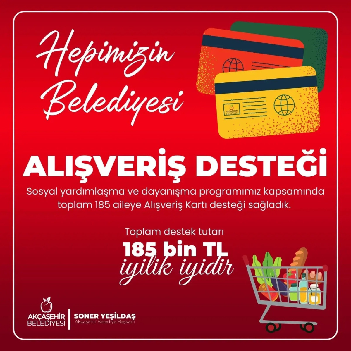 Akçaşehir Belediye Başkanı Soner Yeşildaş, seçim vaatlerini hayata geçirmeye devam ediyor. Belediye, sosyal yardımlaşma ve dayanışma programı kapsamında ilçedeki 185 aileye alışveriş kartı desteği sağladı.