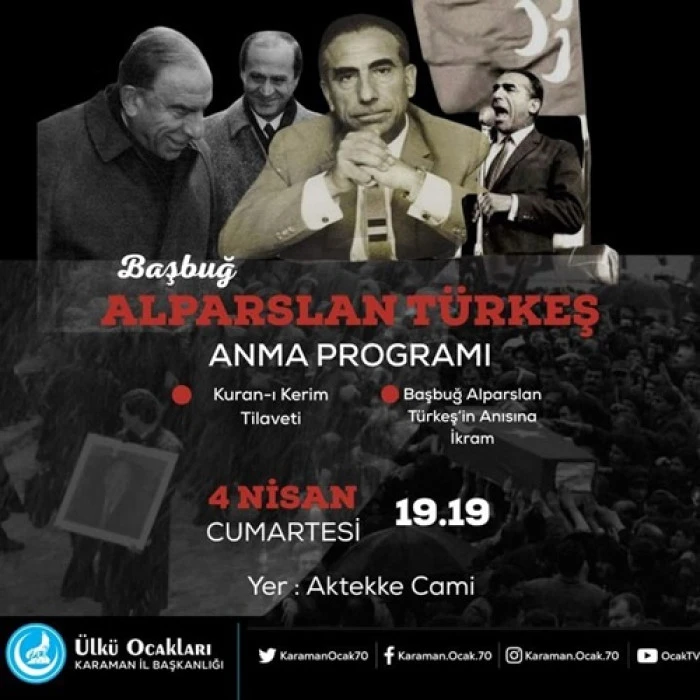 Karaman Ülkü Ocakları İl Başkanlığı, Türk siyaset tarihinin en önemli isimlerinden biri olan merhum Alparslan Türkeş’in vefat yıl dönümü vesilesiyle Aktekke Camii’nde bir anma etkinliği gerçekleştireceğini duyurdu.