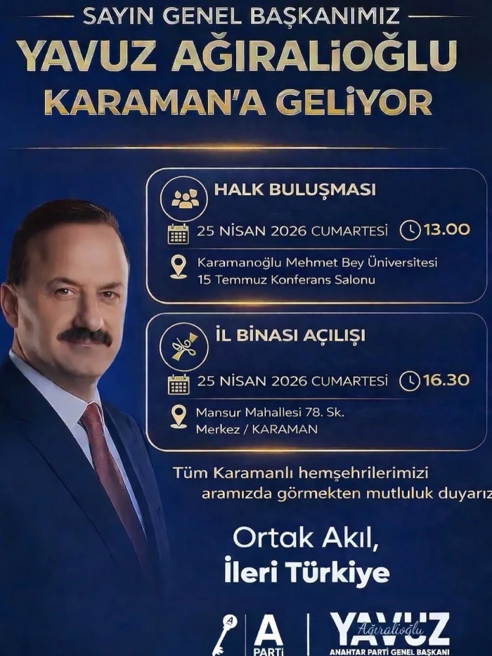 Anahtar Parti Genel Başkanı Yavuz Ağıralioğlu, 25 Nisan 2026 Cumartesi günü Karaman’da vatandaşlarla bir araya gelecek.