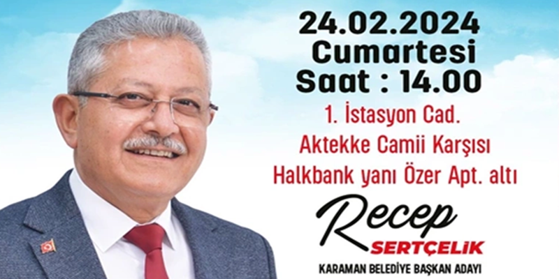 Cumhuriyet Halk Partisi Karaman Belediye Başkan Adayı Recep Sertçelik, seçim çalışmalarında kullanacağı Seçim Bürosunu açıyor.