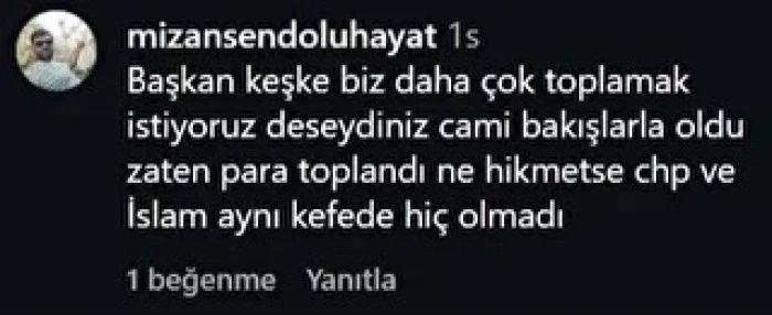 -Başkan keşke 'biz daha çok toplamak istiyoruz' deseydiniz. Cami bağışlarla oldu zaten; para toplandı. Ne hikmetse CHP ve İslam aynı kefede hiç olmadı.
