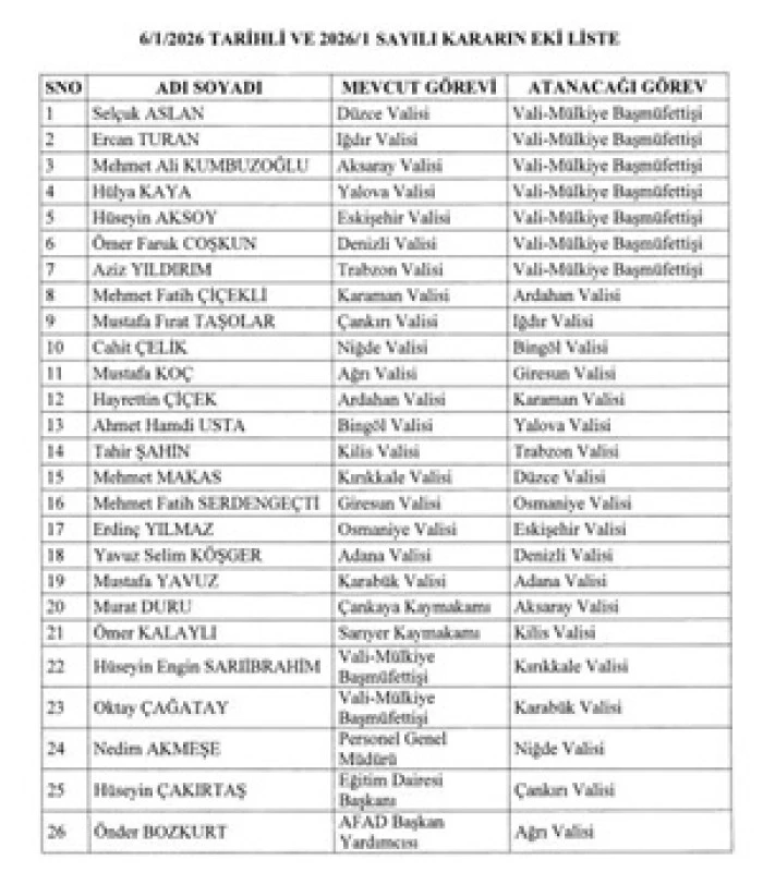 Cumhurbaşkanı Recep Tayyip Erdoğan’ın imzasıyla Resmî Gazete’de yayımlanan 6 Ocak 2026 tarihli ve 2026/1 sayılı kararnameye göre; Kararname ile Karaman Valisi olan Mehmet Fatih Çiçekli Ardahan’a, Ardahan Valisi olan Hayrettin Çiçek Karaman’a atandı.