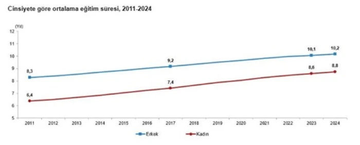 Ulusal Eğitim İstatistikleri verilerine göre Türkiye’de eğitim süresi de son yıllarda önemli ölçüde arttı. 25 yaş ve üzeri nüfusun ortalama eğitim süresi 2011 yılında 7,3 yıl iken, 2024 yılında 9,5 yıla yükseldi. Aynı dönemde kadınların ortalama eğitim süresi 6,4 yıldan 8,8 yıla, erkeklerin ise 8,3 yıldan 10,2 yıla çıktı.