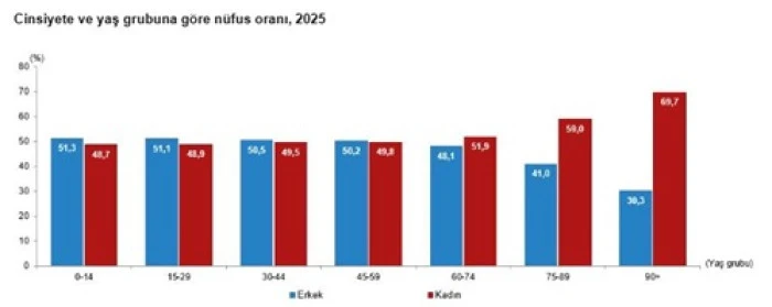 Adrese Dayalı Nüfus Kayıt Sistemi sonuçlarına göre ülkede kadın nüfus 43 milyon 32 bin 734 kişi, erkek nüfus ise 43 milyon 59 bin 434 kişi olarak kaydedildi. Uzmanlara göre bu dengeli dağılım, ileri yaş gruplarında kadınların daha uzun yaşamaları nedeniyle değişiyor. Nitekim 60 yaş ve üzeri nüfus grubunda kadınların oranı belirgin şekilde artıyor. 60-74 yaş grubunda kadınların oranı %51,9’a yükselirken, 90 yaş ve üzeri nüfusta kadın oranı %69,7 seviyesine ulaşıyor.
