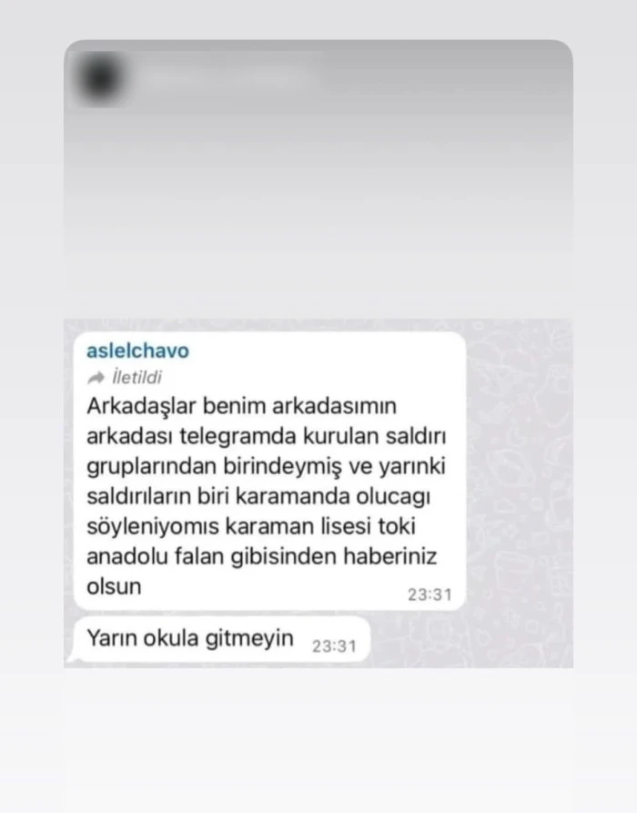 Türkiye’de yaşanan son okul saldırılarının ardından, Telegram üzerinden yayıldığı iddia edilen bir mesaj Karaman’da büyük tedirginliğe neden oldu. Sosyal medyada hızla yayılan mesajda, Karaman’da bazı okullara yönelik saldırı olacağı iddia edilerek “yarın okula gitmeyin” uyarısında bulunuldu.