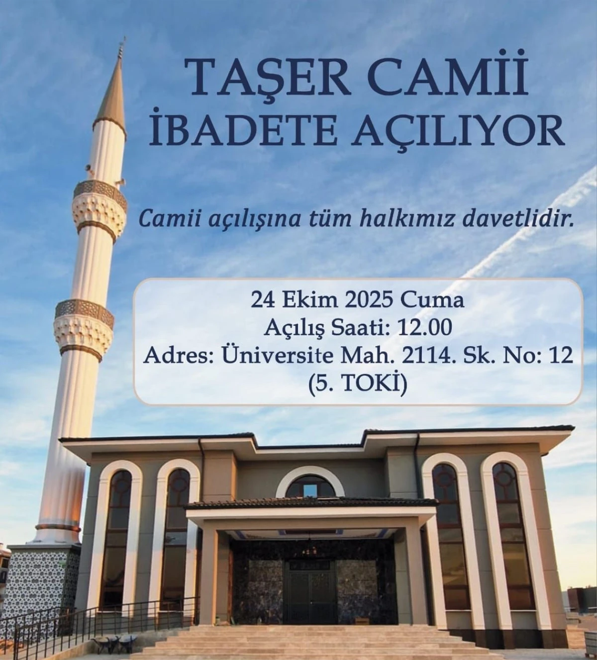 Taşer İnşaat sahibi Ahmet Ali Taşer tarafından yaptırılan cami, Üniversite Mahallesi 2114. Sokak No:12 (5. TOKİ) adresinde yer alıyor. Açılış töreni, 24 Ekim Cuma günü saat 12.00’de gerçekleştirilecek.