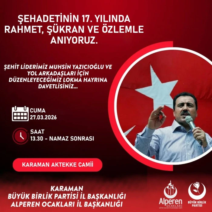 Yarın Cuma Namazına Müteakip Aktekke Camii yanında Şehit Liderimiz Muhsin Yazıcıoğlu ve bütün Şehitlerimiz için lokma ikramımız olacaktır. tüm karaman halkı ve siz basınımızı aramızda görmekten mutluluk duyarız.