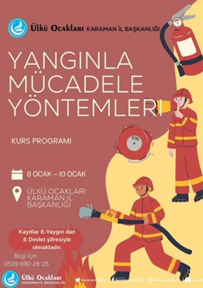 Eğitim programı, 8–10 Ocak tarihleri arasında Ülkü Ocakları Karaman İl Başkanlığı binasında gerçekleştirilecek. Kurs kapsamında katılımcılara, yangın anında doğru müdahale yöntemleri, temel yangın söndürme ekipmanlarının kullanımı ve alınması gereken güvenlik önlemleri hakkında teorik ve uygulamalı bilgiler verilmesi hedefleniyor.